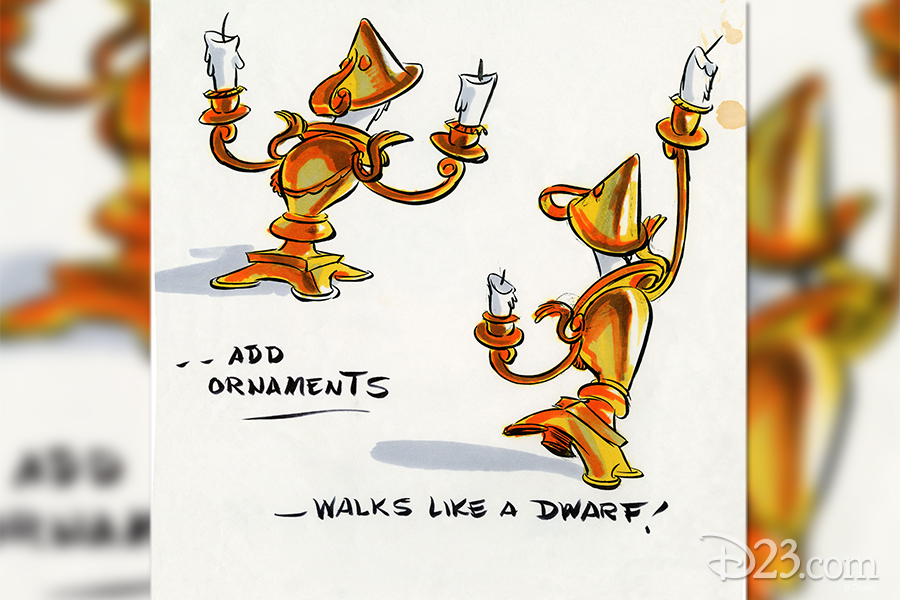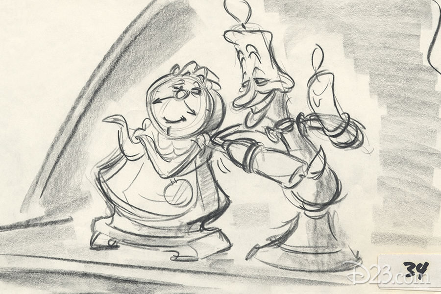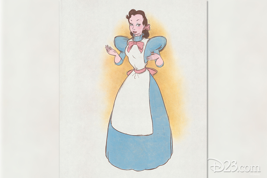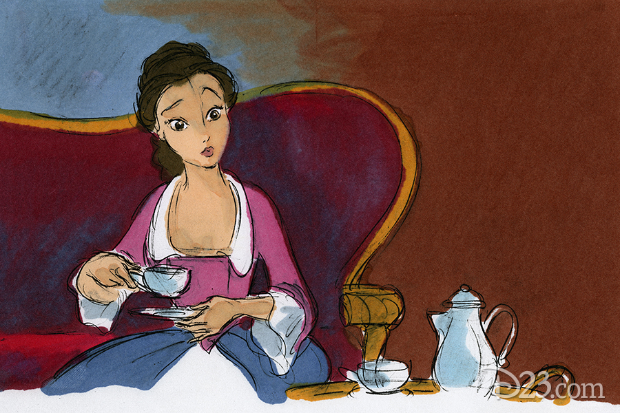 這個形象的貝兒與最後電影中我們看到的版本十分相近了,這個畫面是貝兒與小茶杯、茶壺太太的初次相遇。話說茶壺太太原來是打算要被命名為「洋甘菊夫人」(Mrs. Chamomile),後考慮這個名字對小朋友來說較難發音,才改為「Mrs. Pott」。