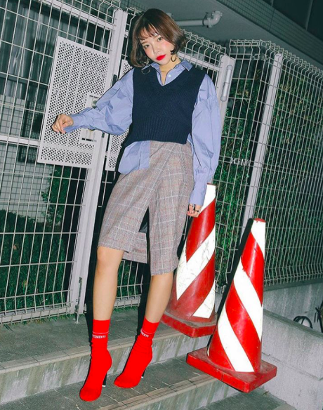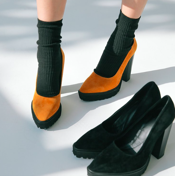 粗跟高跟鞋,搭上襪子會有種帥氣感,喜歡高調一點的妞妞們就可以選擇亮色的襪子,例如:「大紅色、亮黃色、螢光色」......等,就會很潮很亮眼;但如果是比較低調的妞妞們,黑色襪子則會帶點學生妹的感覺,妞編輯就是喜歡臉蛋可愛但有著大長腿的妹子~